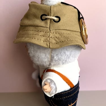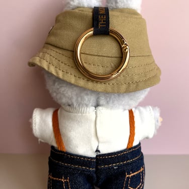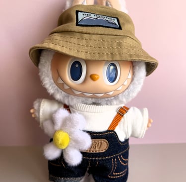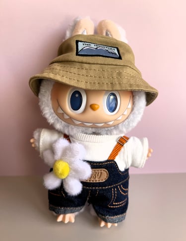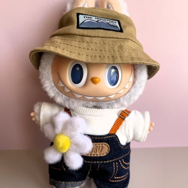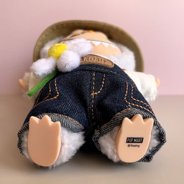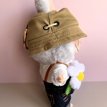 The Fall in Wild pendant is part of POP MART’s The Monsters / Labubu line. She is decked out in denim overalls over a crisp white T-shirt with a brown or tan bucket / fisherman’s style hat and a patch that says “The Monsters”, and the adorable daisy flower she holds adds an outdoorsy vibe to the outfit. The plush itself is white and her eyes are sapphire blue color. Her light orange nose matches perfectly with the slightly darker orange on her overall straps.